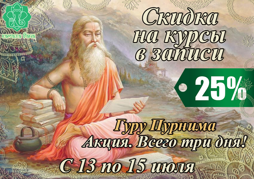 В честь праздника Гуру Пурнима Центр «Камала Вана Джйотиш Махариши» объявляет акцию: скидка на курсы в записи! Всего три дня, воспользуйтесь этим шансом для изучения духовной науки.