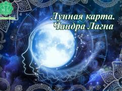 Лунная карта строится следующим образом. Дом, в котором расположена Луна, ставится на место 1-го дома. То есть знак, в котором расположена Луна, становится Лагнешей, все планеты остаются в своих знаках, но меняются дома в соответствии с Лунным 1-м домом. Если Луна в 1-м доме, то при таком положении Луны совпадает Лунная карта и карта Раши – у человека усиливаются все сферы жизни. В этом случае Луна даёт округлое лицо, бледный цвет кожи, голубые...