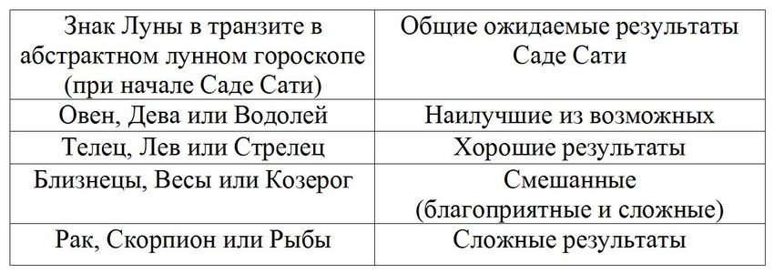 В других источниках описывается то же самое, но немного другим языком: результаты транзита Саде Сати, исходя из положения Луны в транзите (при начале транзита Сатурна по 12 дому от Луны), относительно транзитной Луны, принимая её положение в абстрактном гороскопе за 1-й дом в Овне: