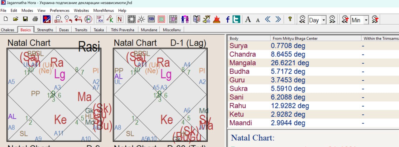 В гороскопе Украины он ретрограден, расположен в Макара во 2 доме, и управляет одновременно 2 и 3 домами. Через раши-дришти он оказывает влияние на Сурью, находящегося в том же градусе в Симхе.