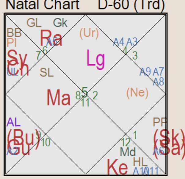 И в Д60 Сурья в Туле в падении е вместе с Чандрой, под влиянием опять Шанайшчарая в виде граха дришти. Занавес…