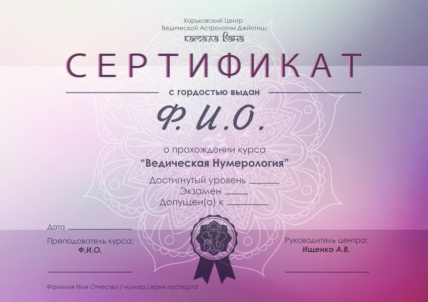 Экзамен по окончании курса. После сдачи экзамена выдается сертификат Центра «Камала Вана Джйотиш» о прохождении курса и сдаче экзамена.