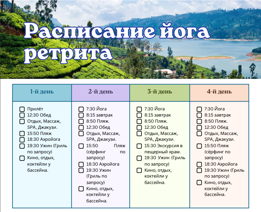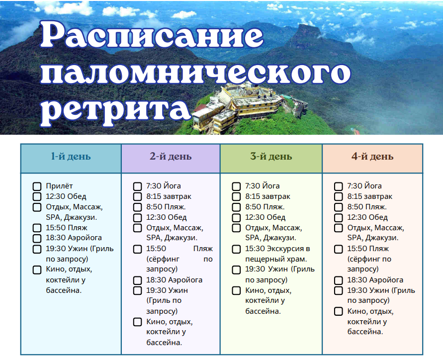 Центр предлагает 3 ретрита: йога, паломнический и сёрфинг ретриты.