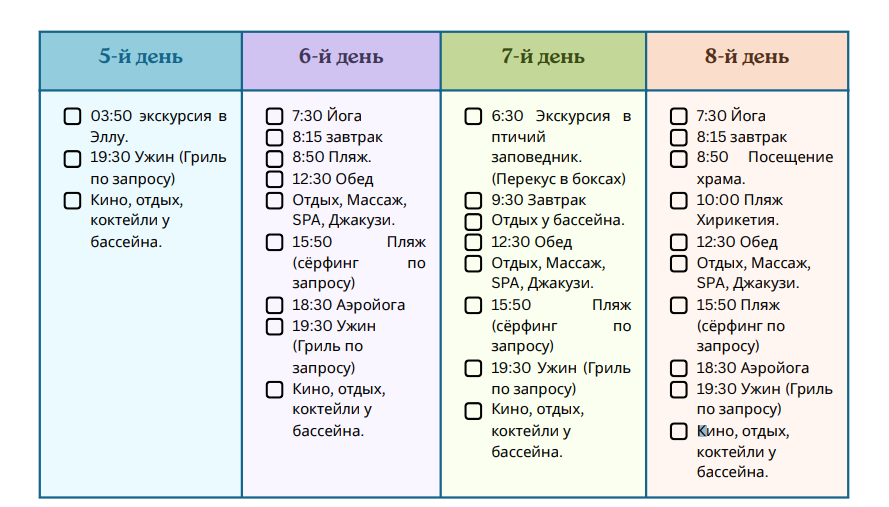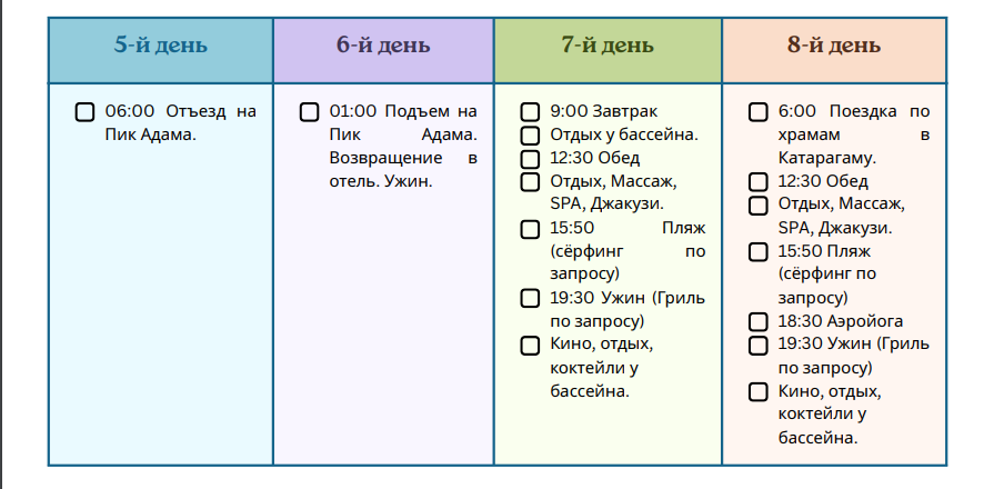 3 экскурсии (Пик Адама, 9-ти арочный мост, чайные плантации, водопад Равана, посещение Эллы, в птичий заповедник Хамбантота и в храмы)