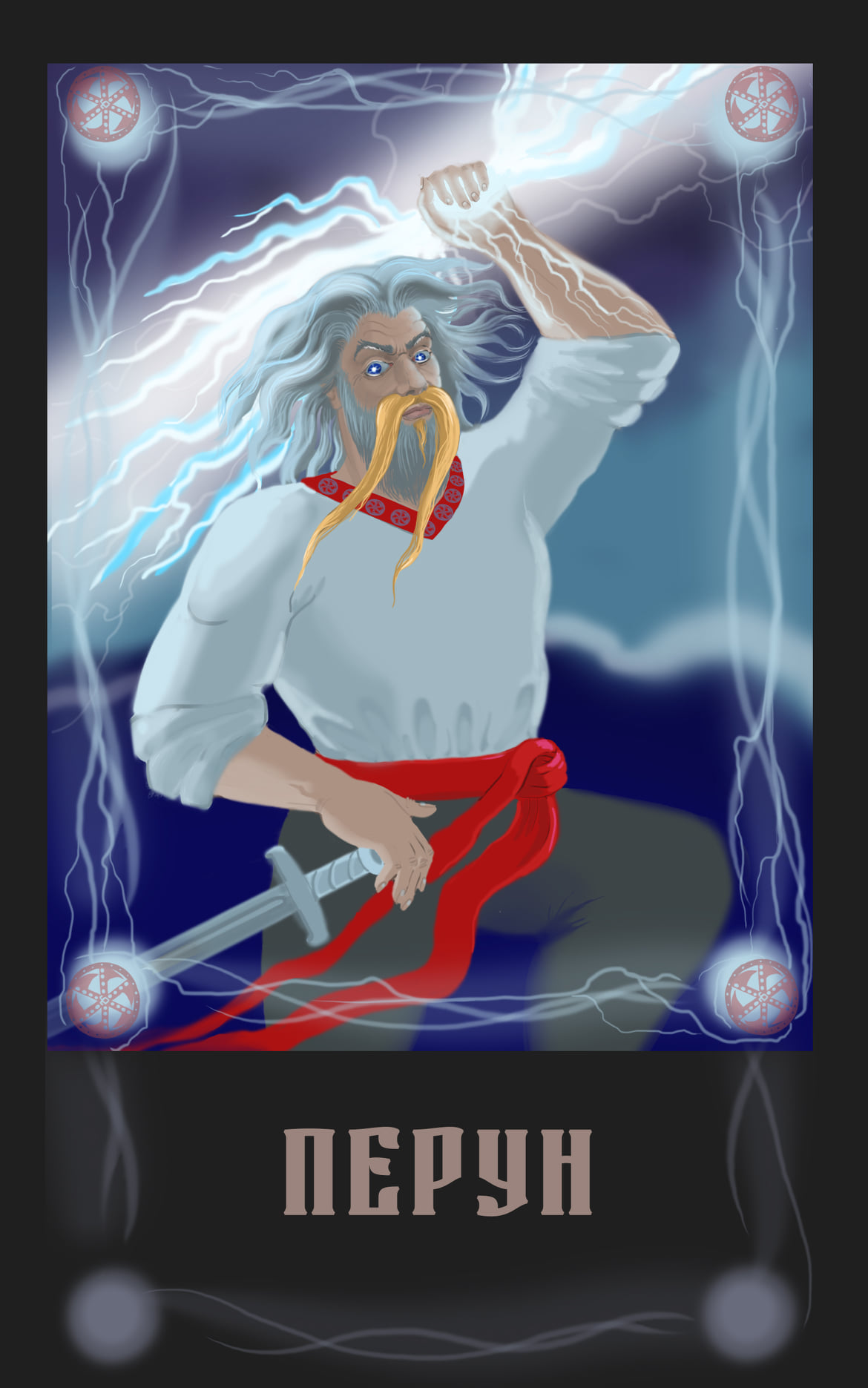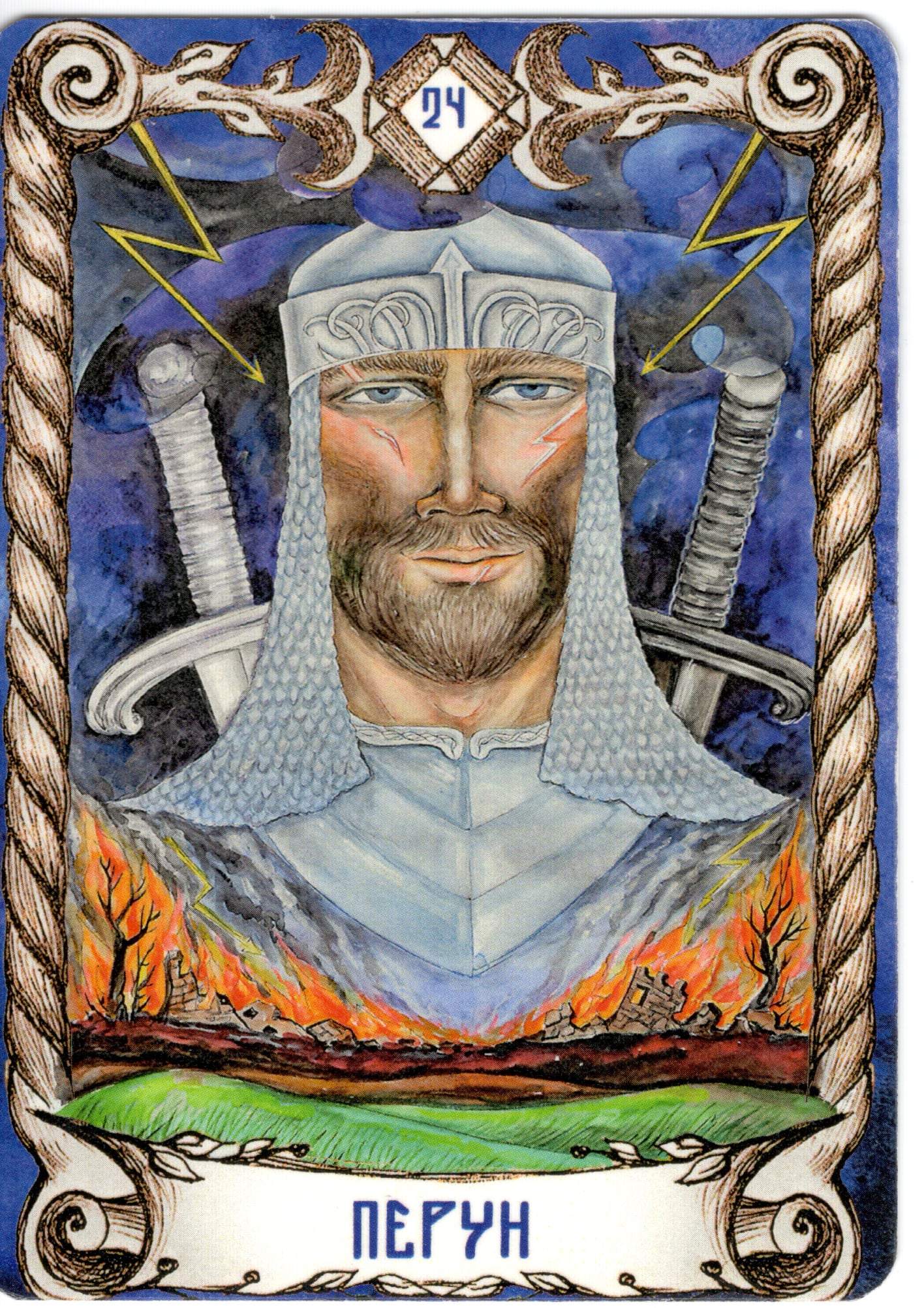 Вернуть его мурти в Киев – дело времени и более глобальных процессов, но вчера мне пришло, что мы можем сделать уже сейчас, прямо там где находимся: у многих из моих подписчиков есть колоды Славянских Богов Olena Karelina или моя колода Боги и Предки – в них есть изображение Перуна. Ставьте его в красный угол, на алтарь и зажигая свечу, просите прощение за неправедные деяния наши и наших Предков, предлагая ему вернуться на законное место и стать на защиту Правды. У кого нет колоды, размещаю оба изображения здесь – выберите, какое вам больше откликается, у меня стоят оба.
