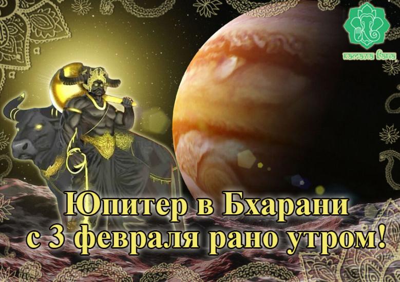 3 февраля утром, около 5 утра, Гуру-Юпитер переходит в накшатру Бхарани, в её первую паду (навамшу) Симхи-Льва и попадает на суд к Богу смерти и справедливости Ямараджу. Жёсткая энергичная накшатра трансформации, рождения нового, обновления.