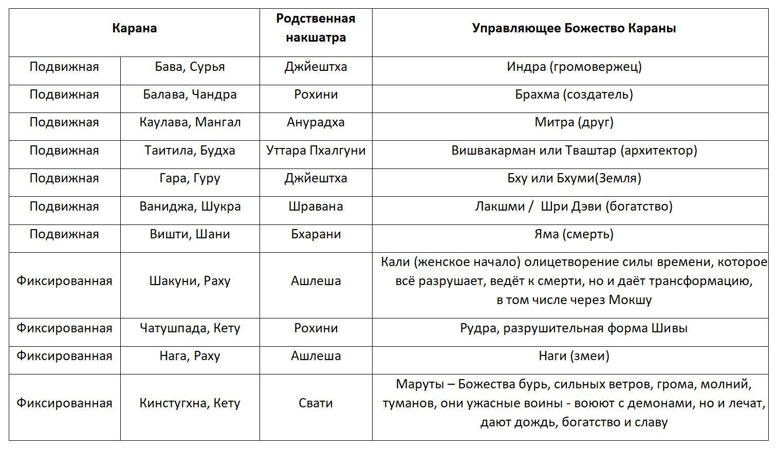 Кроме управителя караны в виде планеты, для каждой караны также существует управляющее Божество и родственная накшатра, которые более глубоко показывают связь караны с профессиональной реализацией человека.