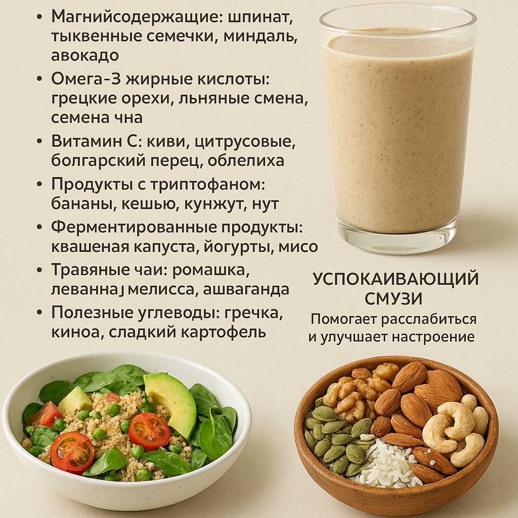 4. Продукты с триптофаном (для синтеза серотонина) – бананы, кешью, кунжут, нут.