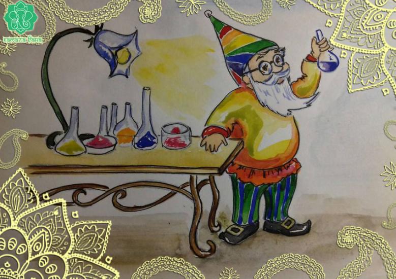– Сейчас узнаешь, – загадочно подмигнул гном в синем костюме и жестом позвал за собой. Он пошёл в один из коридоров пещеры. За ним последовали двое остальных гномов и Мышонок. Пройдя совсем немного, они оказались в просторной комнате. Там на огромном полированном камне, словно на столе, были размещены крупные деревянные миски с разноцветным содержимым, а рядом прозрачные банки. За столом хозяйничал гном в пёстром костюме. Он усердно что-то толок в каждой миске и порошок оттуда пересыпал в прозрачные емкости.