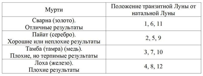 Эта несложная техника применяется, чтобы узнать, каковы в целом будут транзиты планеты в определённом знаке. Для этого необходимо посмотреть день, когда планета переходит из знака в знак, а затем посмотреть в каком доме в этот день была транзитная Луна по отношению к Луне гороскопа рождения. Например, Шани перешёл в Дханур 26 октября 2017 года, Луна находилась в Дхануре – 8 доме от натальной Луны, то есть транзитная Луна оказалась в Дхануре. Мурти нирная будет Лоха, железный, плохой и будет нести негативные результаты.