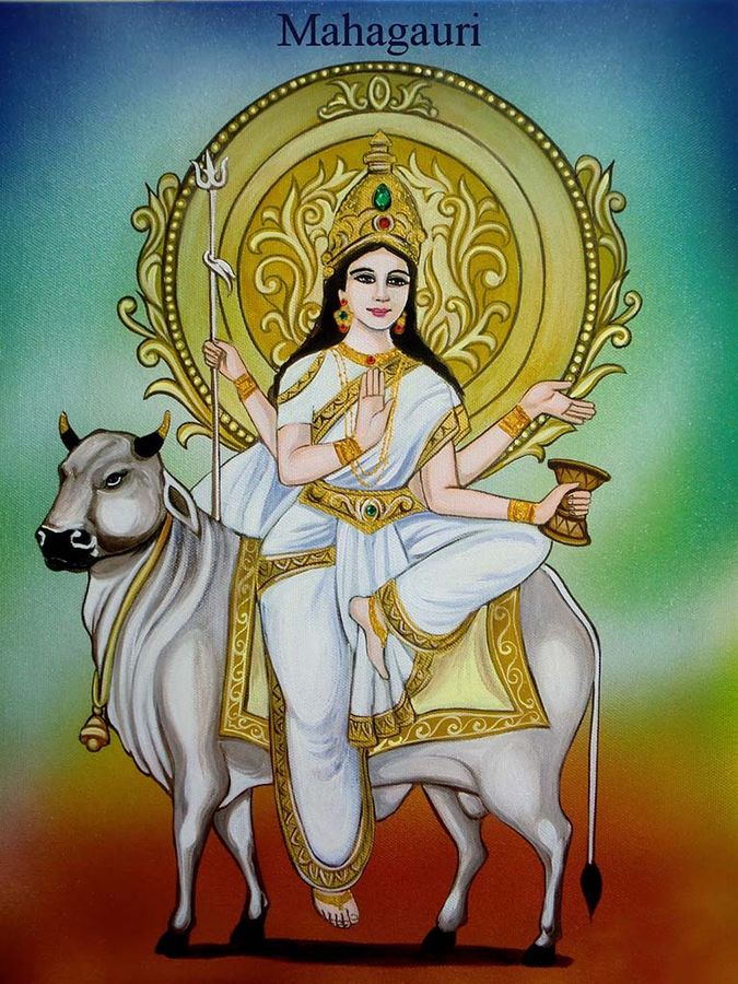 Махагаури («Златокожая») – красивая богиня с четырьмя руками, подобна восьмилетней девочке, она дарует своим преданным внутренний покой. Махагаури одета в белые одежды, восседает на быке, в руках держит барабан и трезубец. На её лице обычно можно увидеть умиротворённое выражение.
