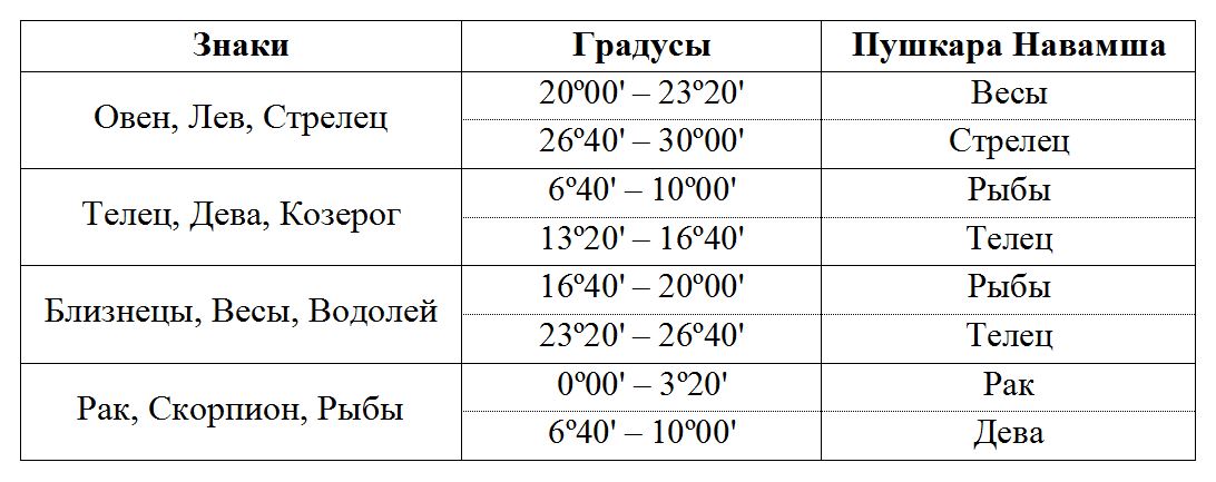 Это особые градусы, где планеты становятся особенно благоприятными для совершения добра. Точный градус (бхага) становится очень могущественным фактором для позитива, хотя навамша (Пушкара) также могущественна, но не так интенсивна, как градус. Градусы пушкары используются в мухурте.