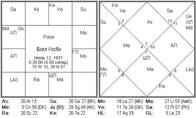 Пример: Карта Билла Косби. Здесь Луна и Раху аспектируют знаковым аспектом Лагну в Овне. Меркурий и Марс знаковый аспектируют ХЛ в Водолее. Луна в соединении с ГЛ в знаке Льва, под знаковым аспектом Марса. Таким образом, здесь целых четыре Карта планеты – Луна, Марс, Меркурий и Раху.