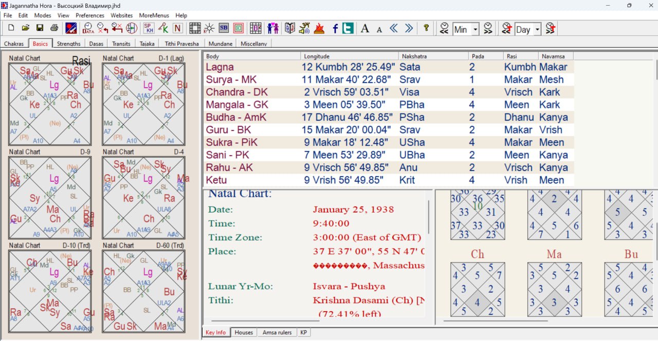 Интересна карта Д10, где могут быть 2 восходящих знака – или Вришабха Телец или Митхуна Близнецы. С большой вероятностью более подходит Вришабха Телец. Во-первых Аматья карака как рабочий инструмент в его профессии стоит в 1 доме и в Д1 и Д9 этот рабочий инструмент в его профессии подтверждается методами Джаймини колоссально высокой Аштакаваргой. И Будха в Д10 хозяин 2 дома, который подпитывает личность человека в его профессии. Будха речь и голос как хозяин 2 дома в Д10 в 1 доме. Далее Гуру стоит на троне профессии в Кумбхе – в профессии идейный и идеологический бунтарь с невероятной популярностью и оттого имеющего и проблемы в социальной реализации от власть имущих. АЛ вместе с сильнейшей Чандрой – колоссальная известность в свой профессии в 3 доме актёрского мастерства. Шукра хозяйка 1 дома стоит в 8 с Сурьей и Мангалом – Человек поднимает запретные темы и делает это ярко, харизматично, энергично с надрывом и на грани...