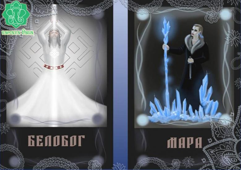 Белобог светит ясно, иногда слишком ясно, ведь Мара предпочитает сумерки, полутона и тёмные цвета, а он безжалостно вскрывает в ней привязанности и иллюзии, заставляет пересматривать своё отношение к материальным ценностям. Загадочная Мара цепляет романтические струны в душе Белобога, влюбляет в себя, ничего не делая для этого умышленно. Она заставляет его сердце биться быстрее, хотя сама остаётся холодна и разумна – именно её невозмутимость привлекает и очаровывает Белобога.